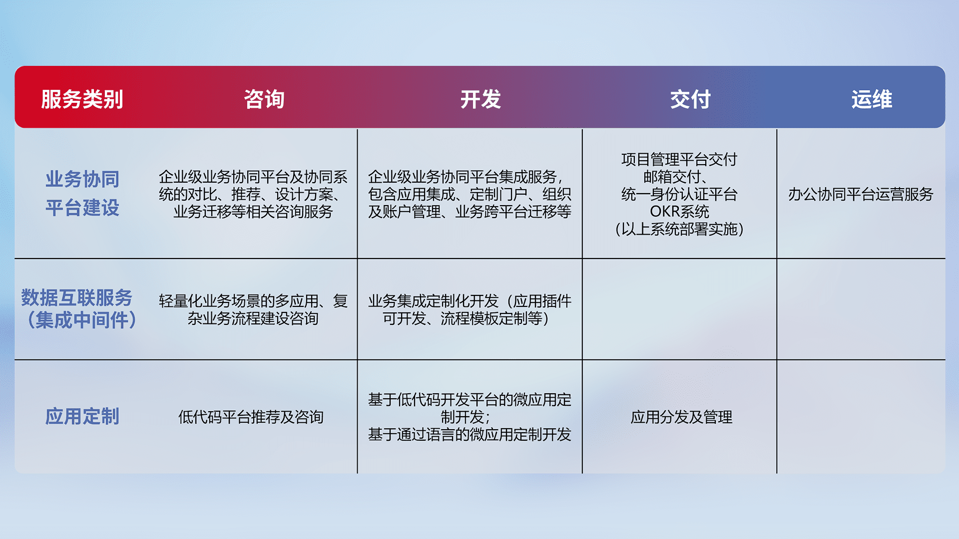 针对钉钉、、、企微、、、、IDaas等平台级产品提供产品的规划、、、、方案、、、、交付、、、定制化开发等服务,,,实现如统一协同办公、、、智能客户服务、、混合会议管理、、、智能数据查询、、、等业务场景,,,,实现数字化转型。。
