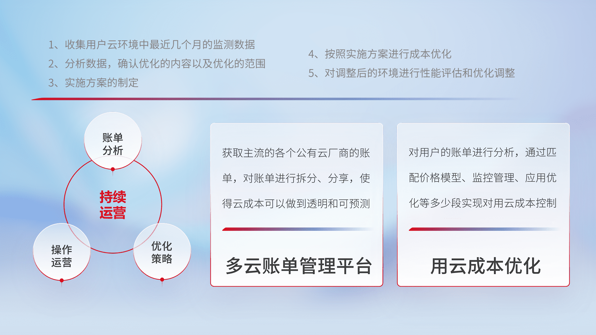 通过多云纳管,,以统一的资源数据模型把客户的云资源进行抽象和封装,,进而实现对多云资源的统一操作,,,保障云资源管理的可靠性、、、、稳定性与可用性。。。量身定制化运维内容,,,,配置、、、、开发运维、、、补丁管理、、备份、、监控、、、、认证和访问管理、、、审计和日常巡检等,,保障在用云过程中的可靠度,,稳定度以及高可用率。。。。